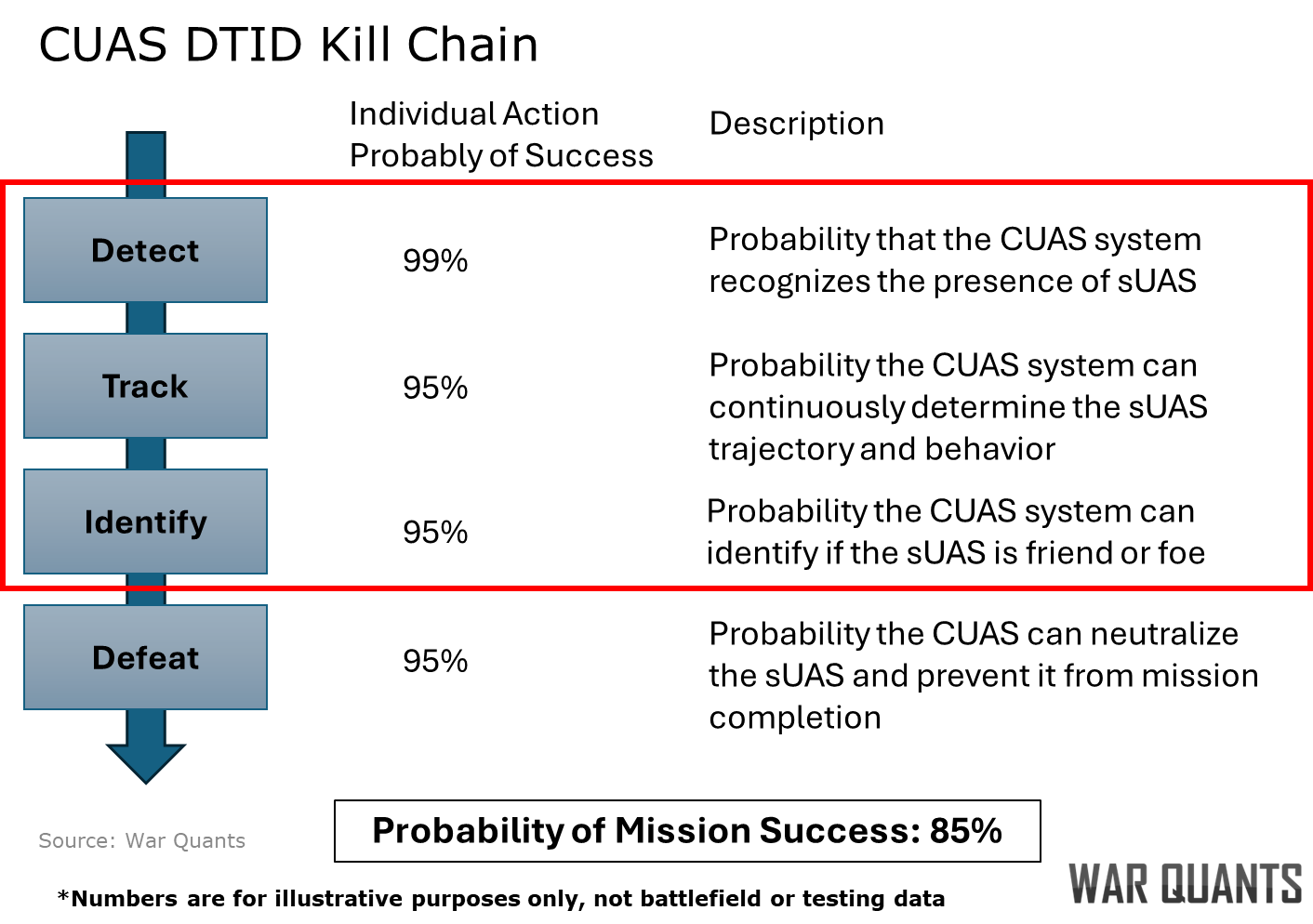 In the case shown, the CUAS system has a 99% probability of detecting, a 95% chance of tracking, and a 95% chance of identifying a sUAS. When coupled with a 95% defeat probability, the overall chance of defeating a sUAS is 85%. This probability may seem high; however, it corresponds to only defeating six sUAS on average before one gets through. Future CUAS systems will require significantly higher success rates.