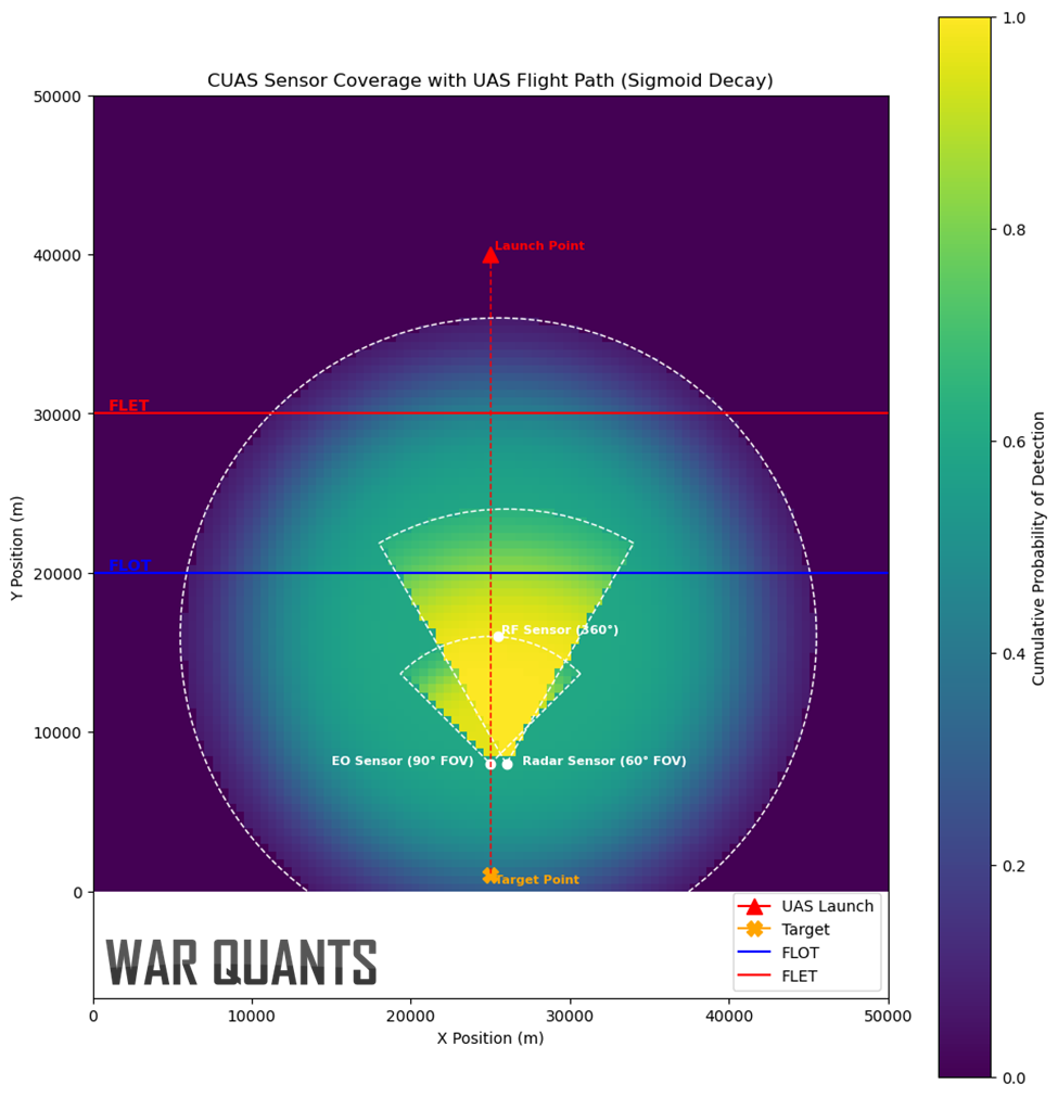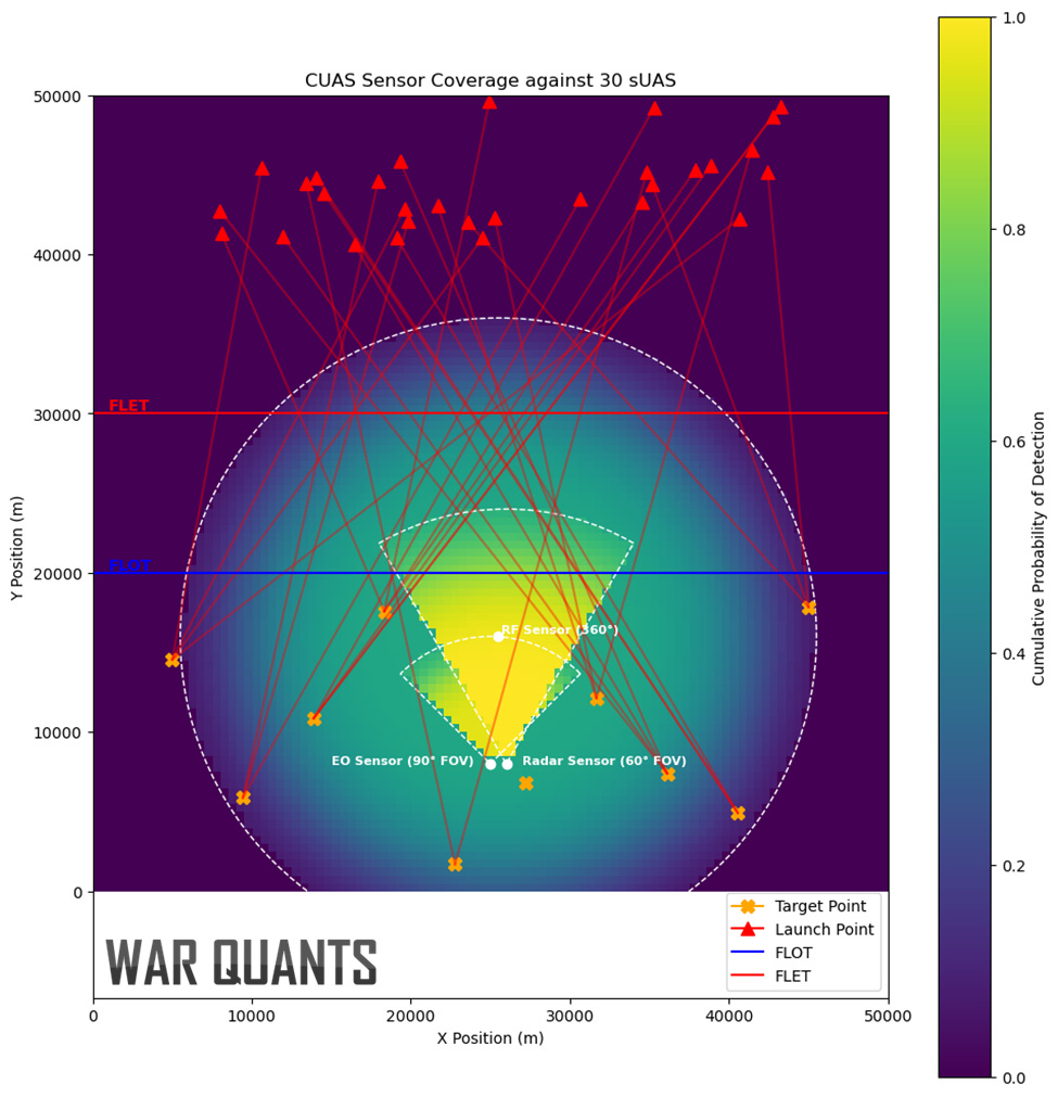 The first step in defeating a drone threat is detecting it. However, the challenge of detecting small UAS (sUAS), which are often quiet, slow, and low-flying, introduces a layer of complexity that traditional air defense systems were not designed to handle. Environmental clutter, such as bird flights, can confuse sensors and lead to false positive detections. Modern counter-UAS systems require a layered sensor architecture that combines multiple modalities, including RF, radar, acoustic, EO/IR, and data fusion, to integrate all these components. Modeling and simulating these systems-of-systems further helps users optimize their employment. This article is part 2 of the War Quants CUAS Primer, and dives into modeling CUAS sensors on modern battlefields.
