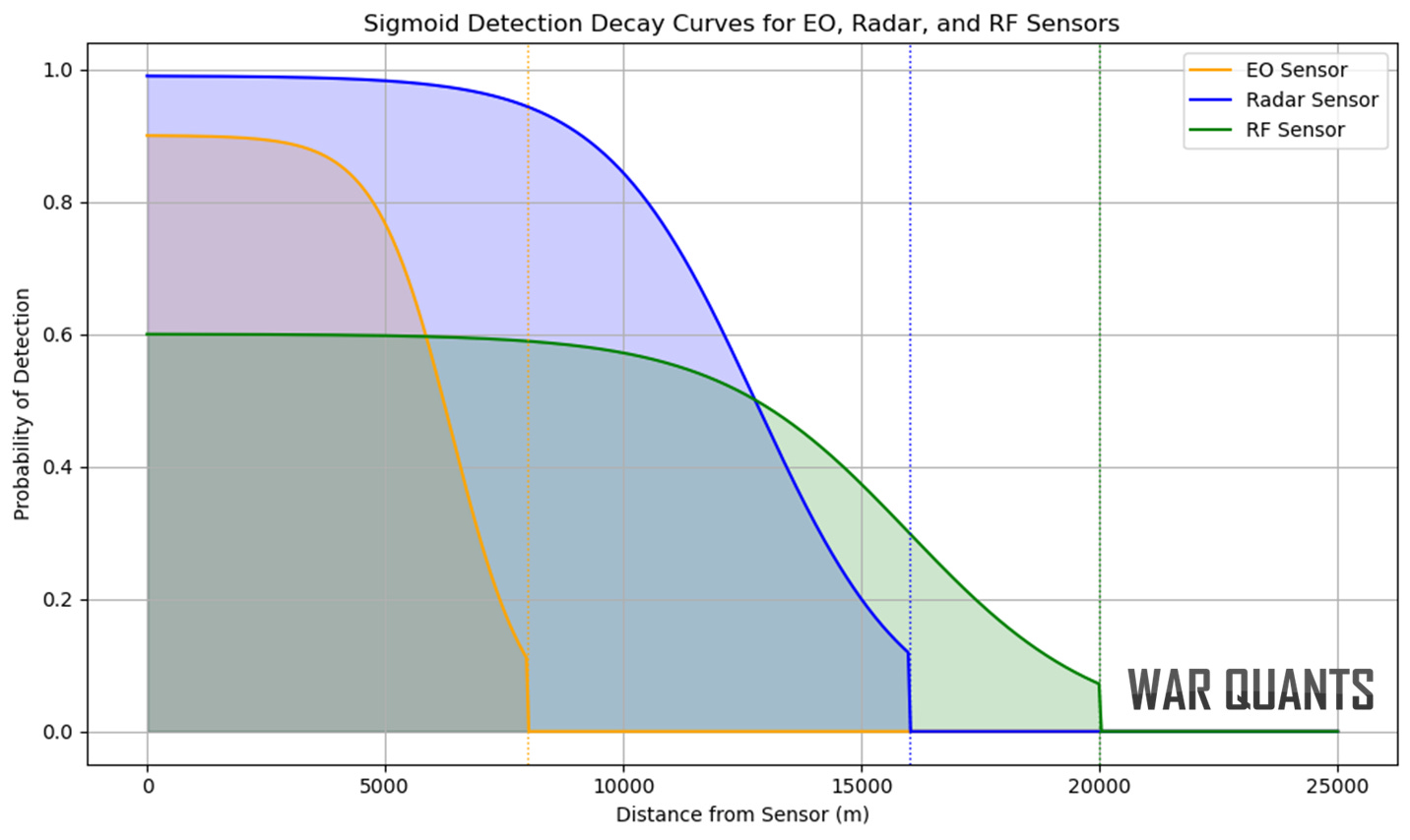 This example uses sigmoid detection-decay curves, where detection slowly decreases and then drops off quickly, reaching zero at the maximum effective range for illustrative purposes.